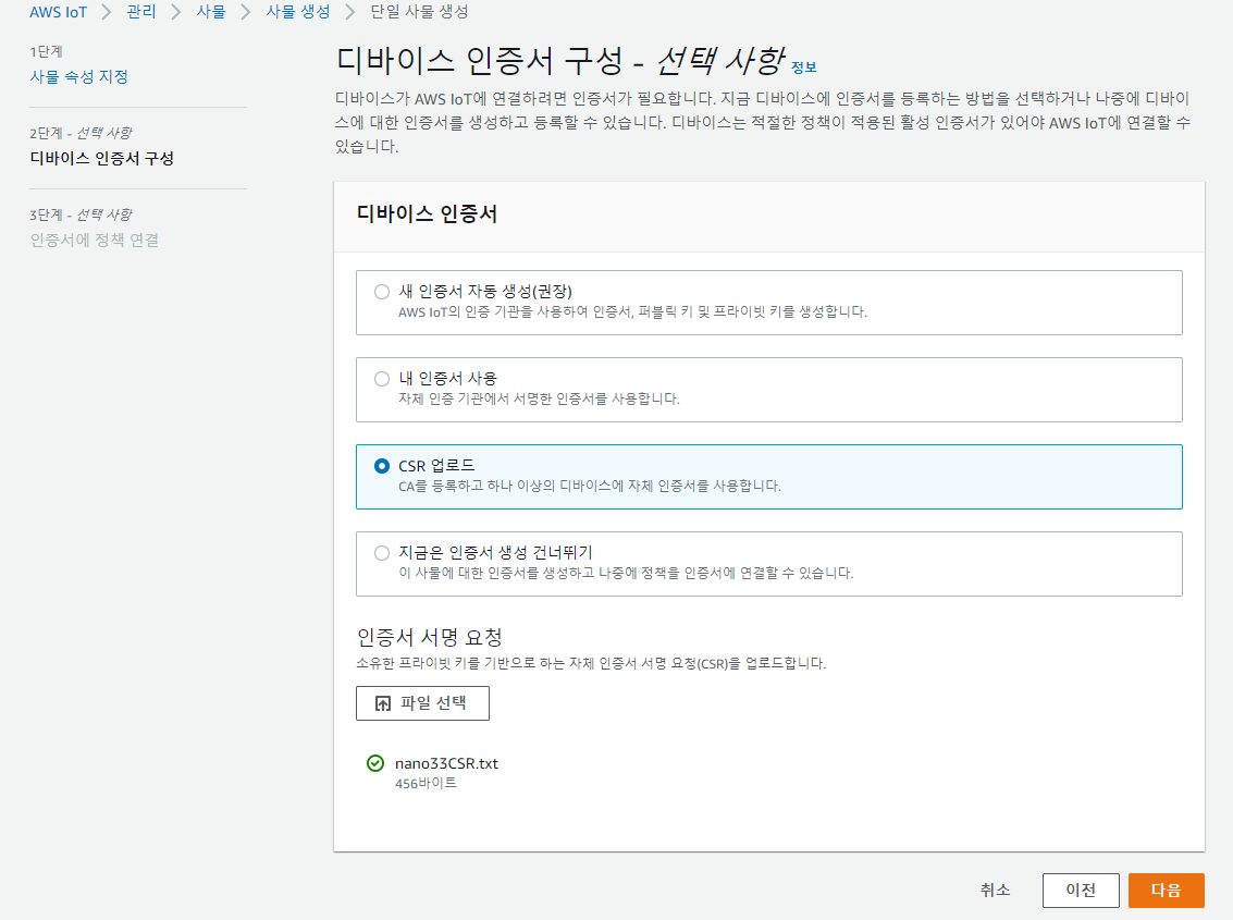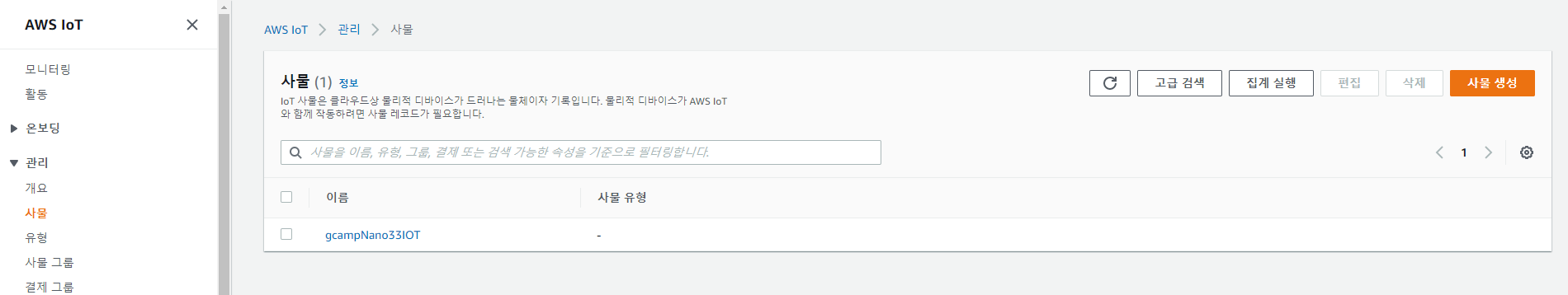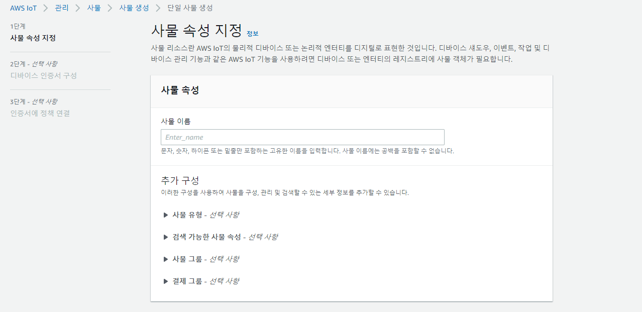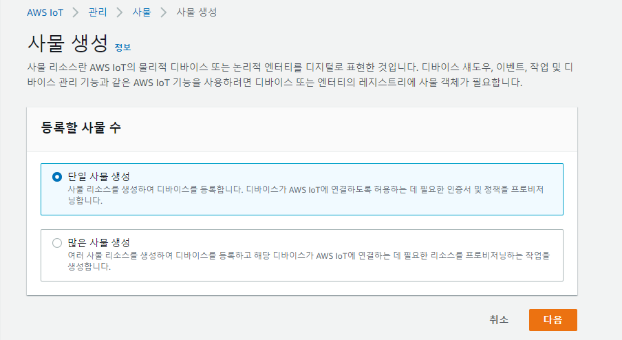 iot사물을 등록한다. 상황에 맞춰서 자신이 선택하면 된다. 여기서는 단일 사물 생성을 선택한다.