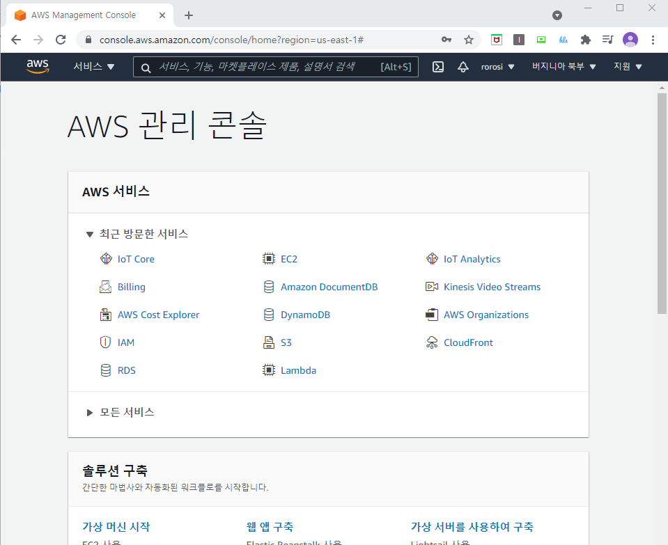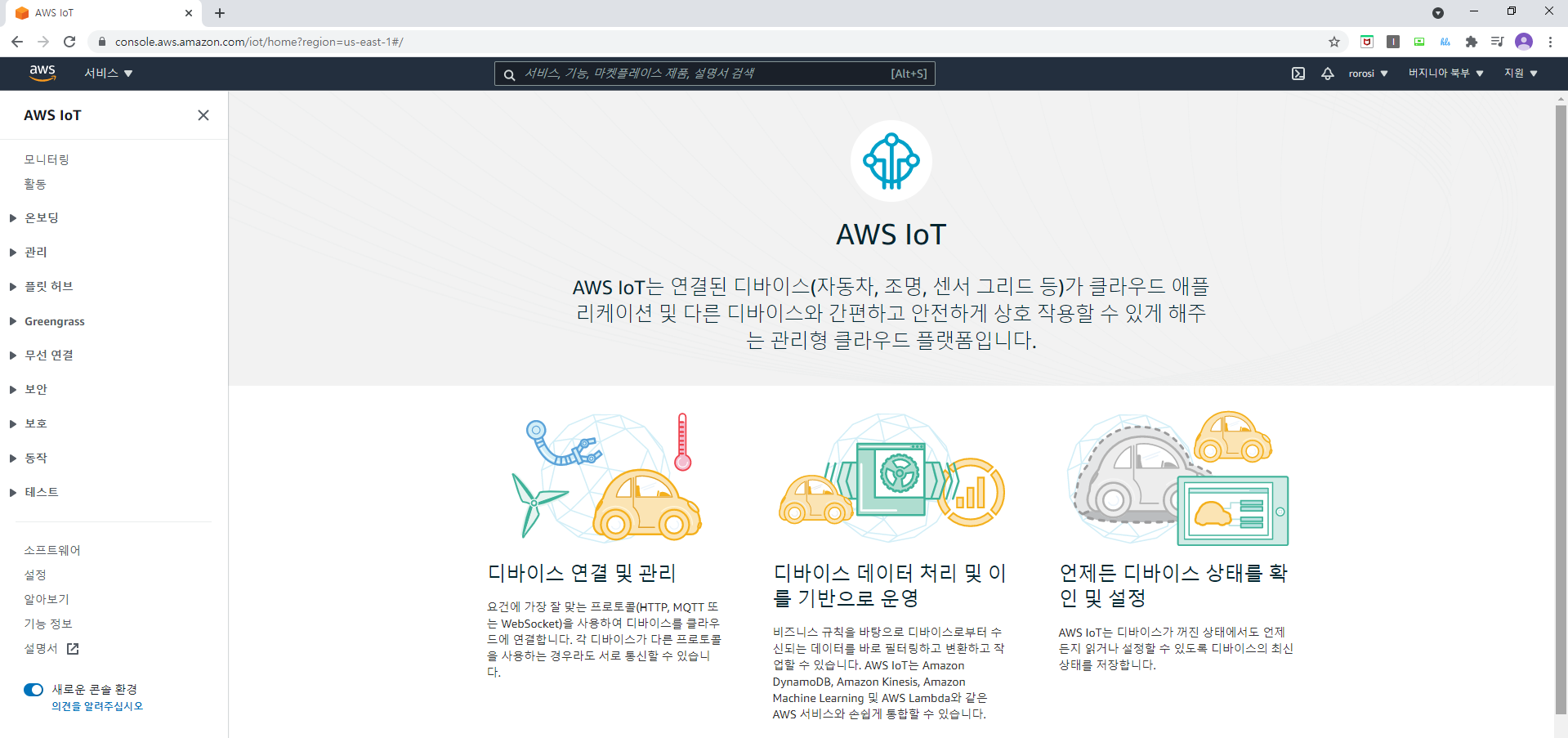 관리 화면에서 오른쪽 위의 계정 옆에 있는 Region은 버지니아 북부로 선택해줍니다. 그다음 검색창에 IoT Core를 입력해 주시고 나오는 서비스를 선택하시면 다음과 같은 콘솔 화면이 나오게 됩니다.