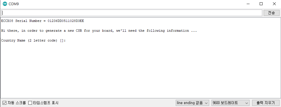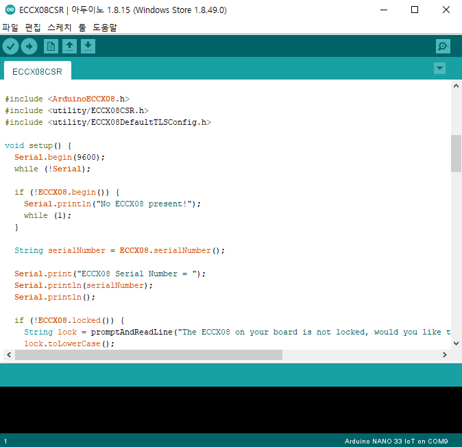 "파일" -> "예제" -> "ArduinoECCX08" -> "Tools" -> ECCX08CSR 선택 -> 업로드