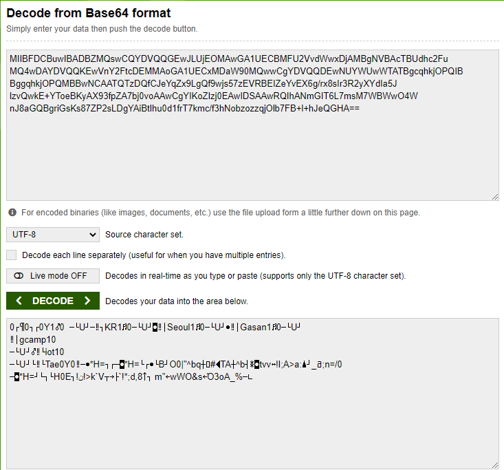인증서 내용을 https://www.base64decode.org/ 에서 Decoding 해보면 다음과 같이 나오게 됩니다.