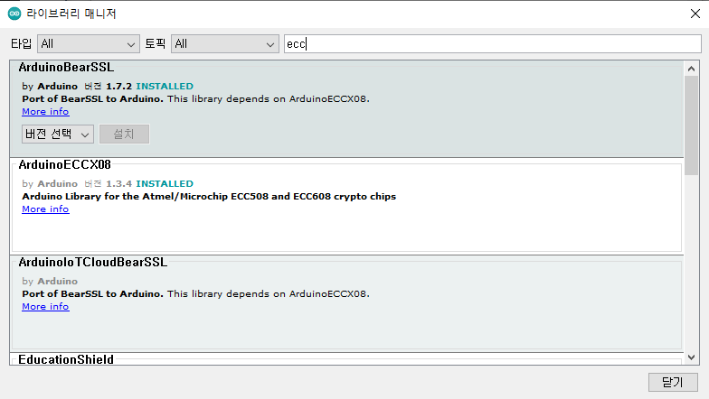 "툴" -> "보드" -> "보드 매니저..." 을 클릭하여 "ecc"이라고 검색한 후 "ArduinoBearSSL", "ArduinoECCX08"를 설치.