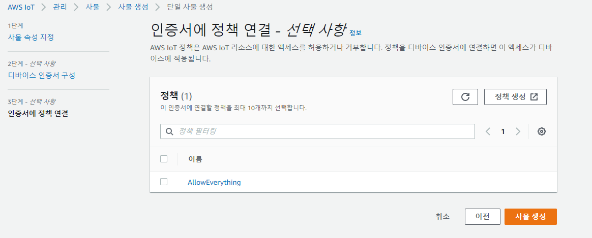 정책은 나중에 연결할 예정이므로 바로 사물 생성을 눌러줍니다.