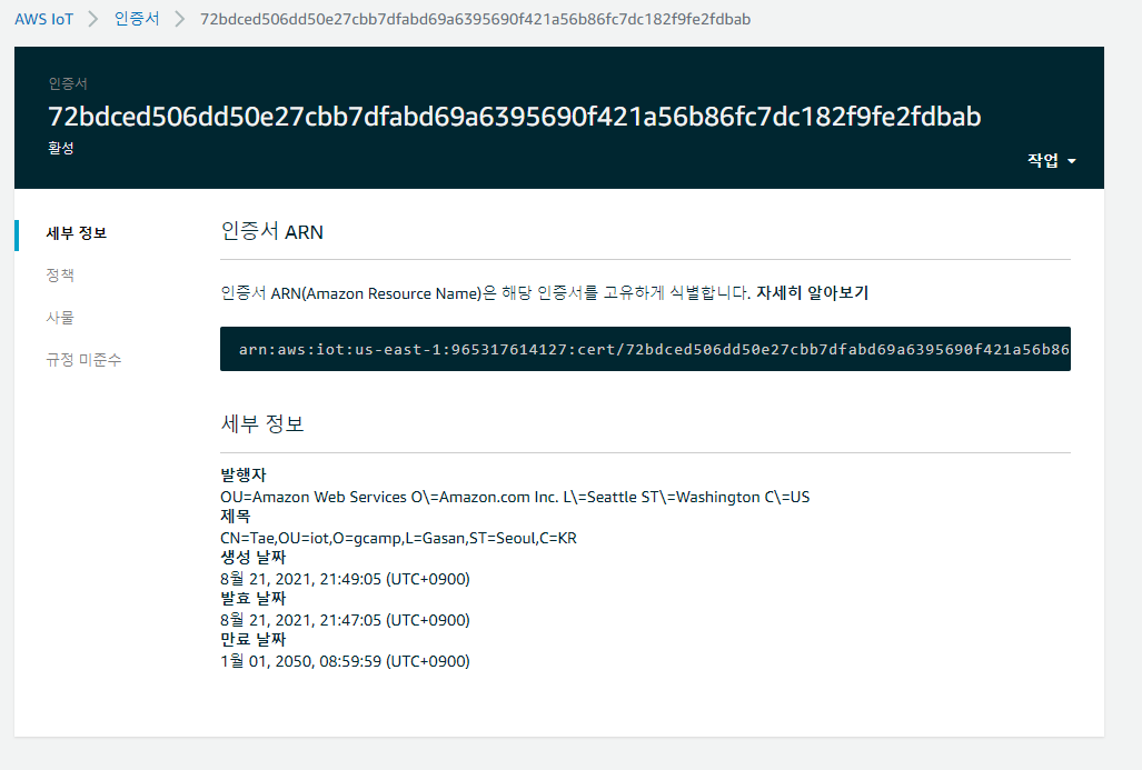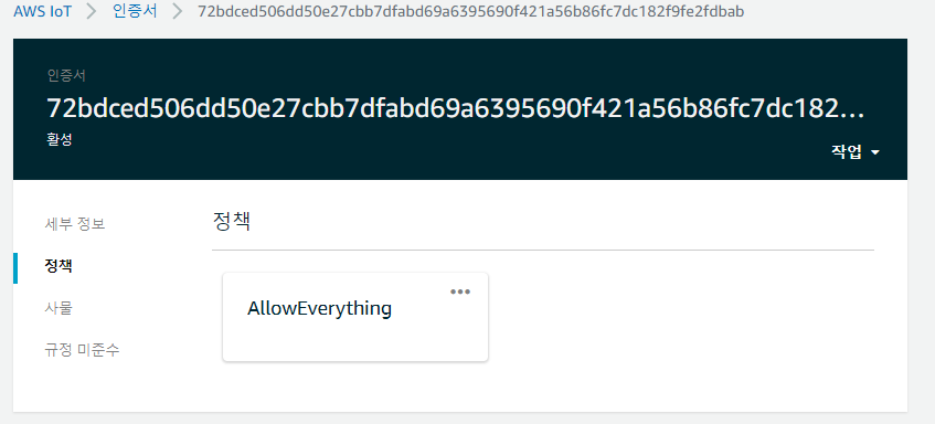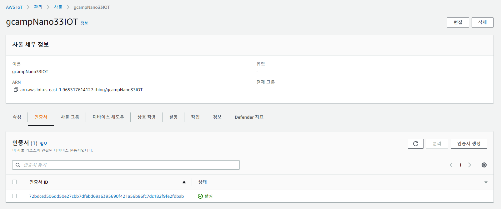 다시 관리 -> 사물로 들어가서 전에 만들어둔 gcampNano33IOT 사물을 선택해줍니다.