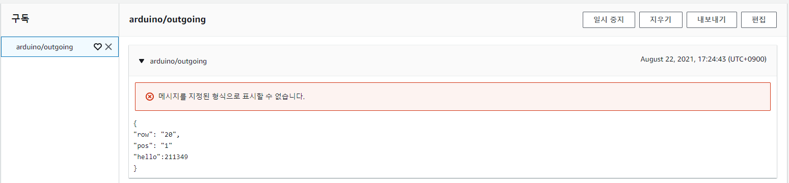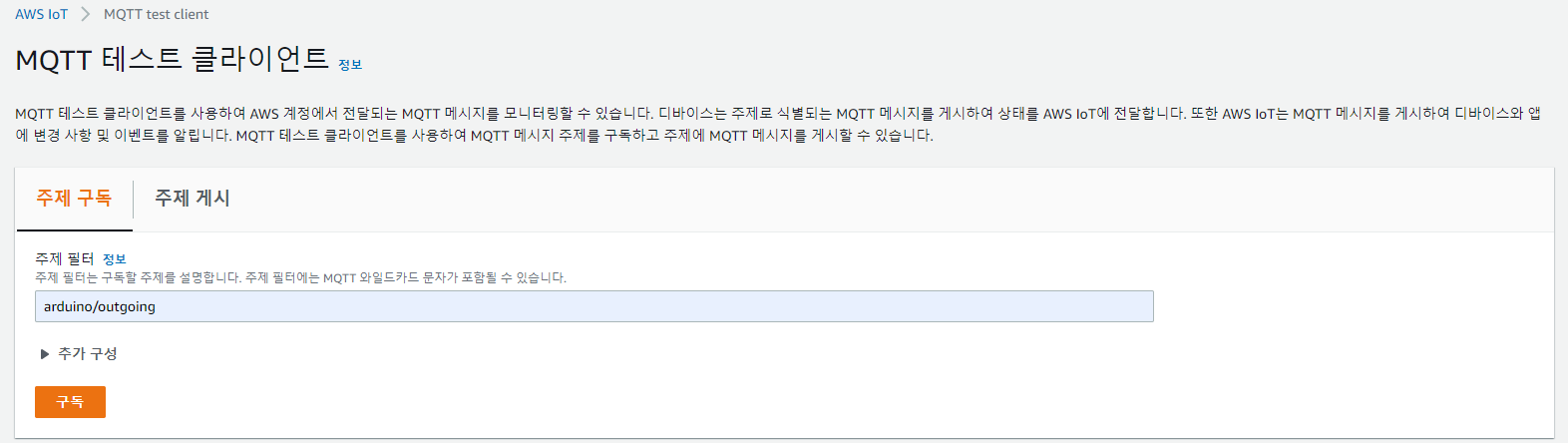 필터에 arduino/outgoing 이라는 토픽을 적고 구독 버튼을 눌러줍니다.