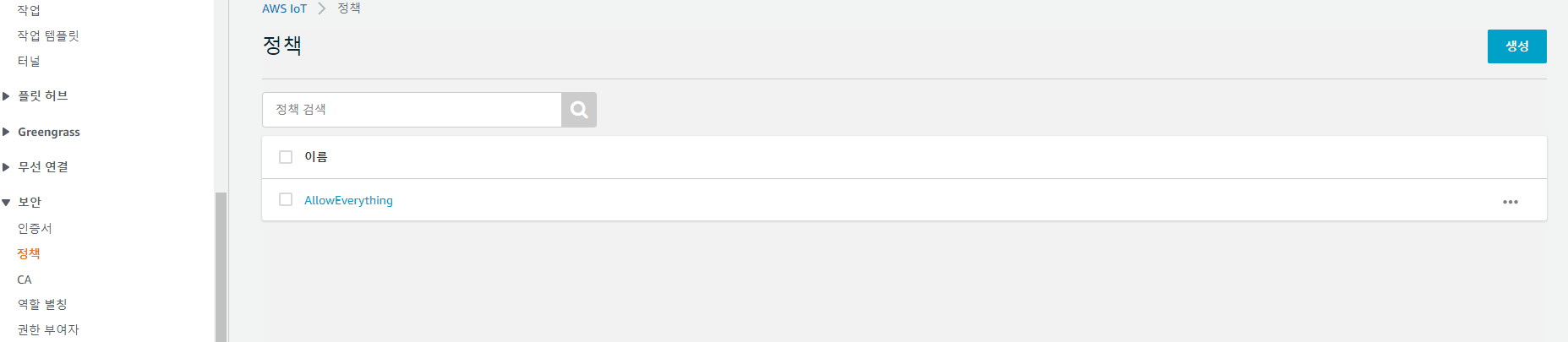 보안 -> 정책 -> 생성을 선택해줍니다.