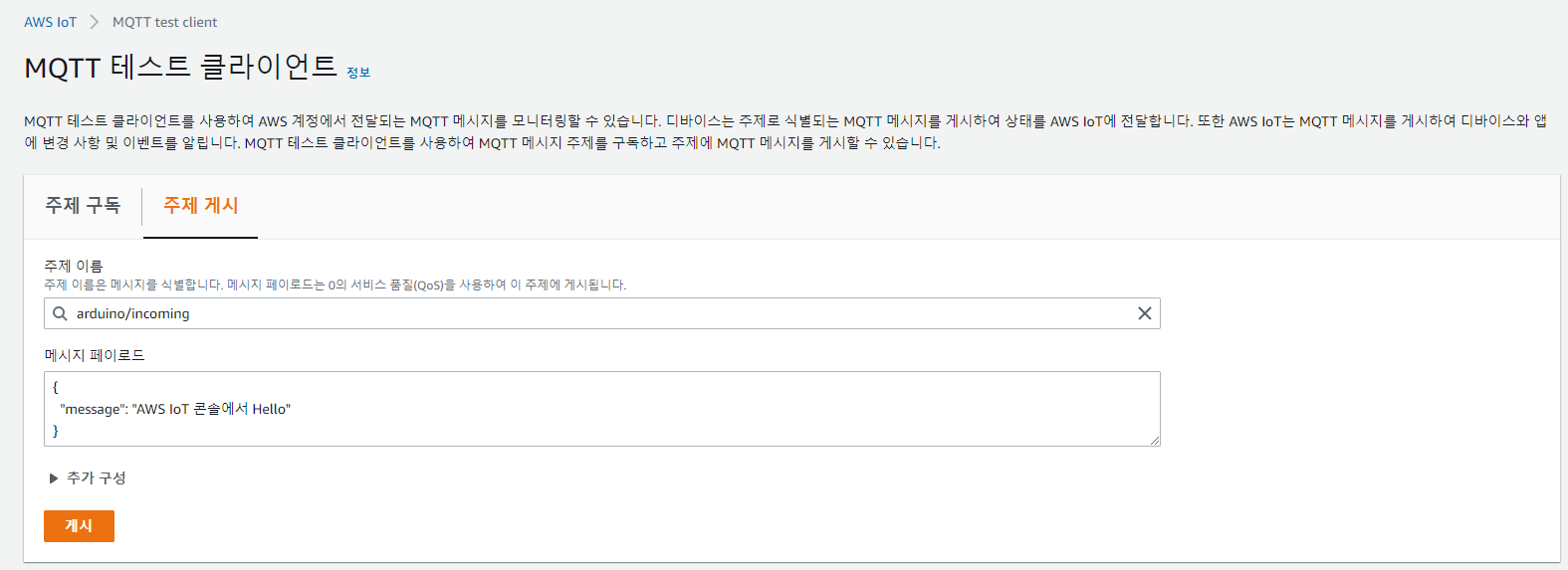 AWS에서 Arduino로 메시지를 보내려면 주제 게시로 들어가 arduino/incoming 토픽을 넣어주고 게시 버튼을 클릭합니다.