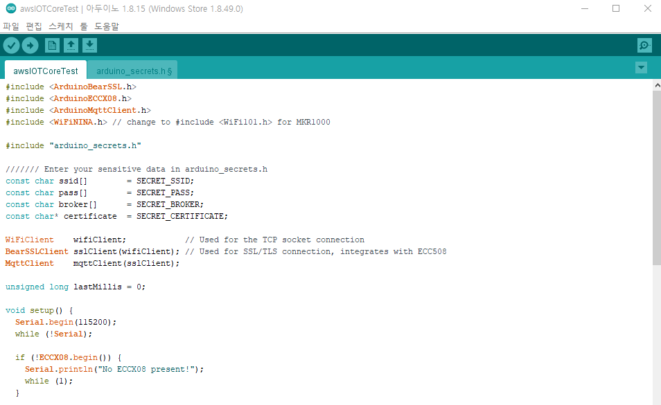 arduino_secrets.h을 다 작성하셨다면 다시 awsIOTCoreTest로 돌아와 업로드 버튼을 눌러줍니다.