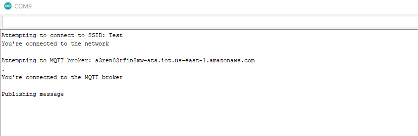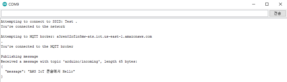 그러면 아까 시리얼 모니터에서 Publishing message가 AWS에 무사히 전송된 것을 확인할 수 있습니다.