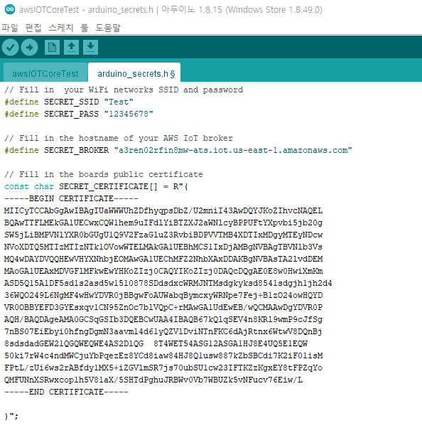 그러면 aws에서 부여해준 key파일이 위와 같이 나오는 것을 확인할 수 있습니다. (인증서 내용은 저와 다른 것이 정상입니다.) 이제 이 key파일을 통해 아두이노와 aws 연결을 시도합니다.