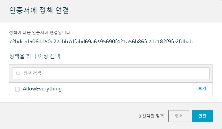 왼쪽 메뉴에 정책에 들어가서 오른쪽 상단에 작업바를 클릭해 정책 연결을 선택하면 다음과 같은 화면이 나오게 됩니다. 아까 만들어둔 AllowEverything 파일을 선택해 연결해줍니다.