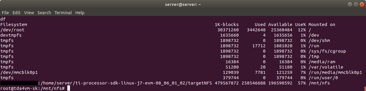 mount -t nfs IP주소:/home/server/ti-processor-sdk-linux-j7-evm-08_06_01_02/targetNFS /mnt/nfs