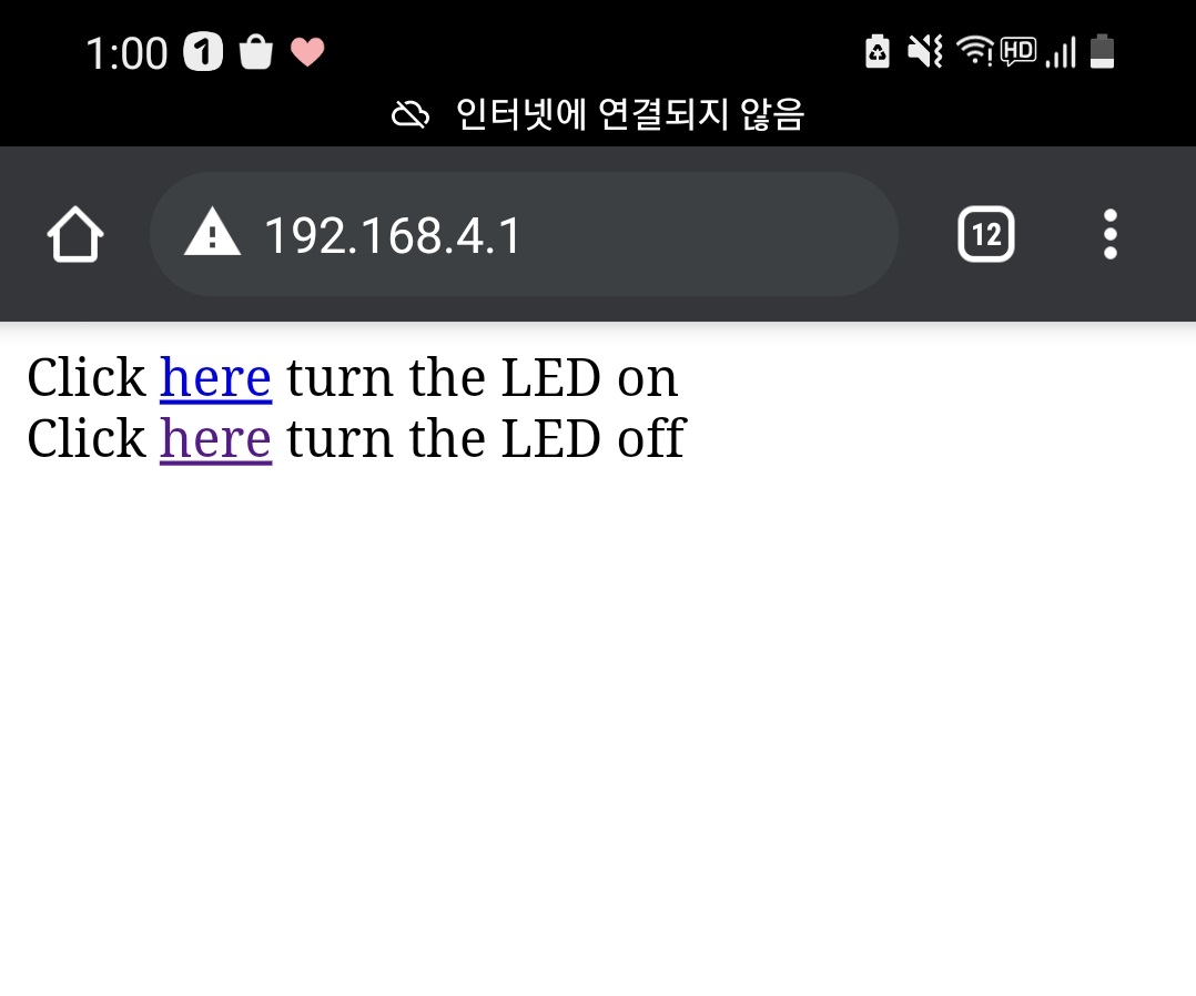 스마트 폰에 연결해 here을 누르게 되면 화면과 같이 출력이 되고 아두이노를 확인해보면