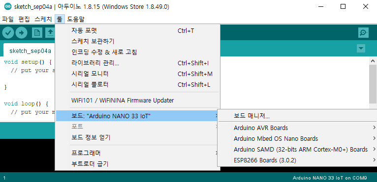 보드를 설치하고 다시 보드 옵션을 확인해보면 Arduino SAMD 하위에 Arduino NANO 33 IoT 보드를 확인할 수 있습니다. 이어서 NANO 33 IoT를 선택하여 보드를 설정합니다.