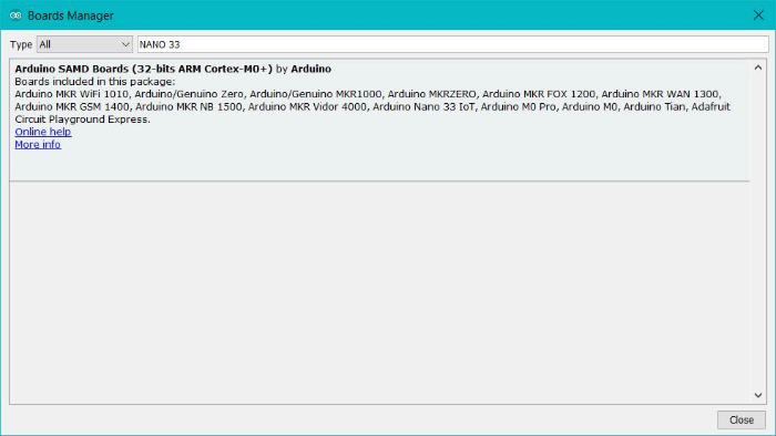 보드매니저 검색창에서"NANO 33"이라고 검색하고 'Arduino SAMD Boards (32-bits ARM Cortex-M0+)'를 확인하고 설치합니다.
