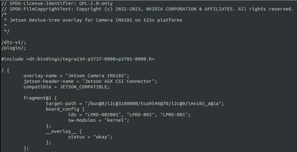 실제 imx185의 dts 파일은 아래와 같다.