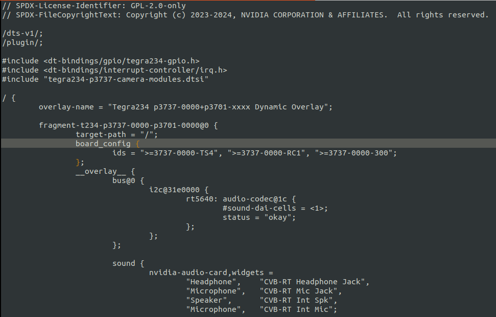 dts파일의 board_config의 ids 속성은 board-id 목록을 지정할 수 있으며, 그 중 하나는 카메라 EEPROM에서 읽은 ID와 일치해야 하고, board_config의 sw-modules 속성은 오버레이를 UEFI DTB에만 적용해야 하는지, 커널 DTB에만 적용해야 하는지, 아니면 둘 다에 적용해야 하는지 지정할 수 있다. 이 속성이 없으면 오버레이는 커널과 UEFI dtb에 모두 적용된다.