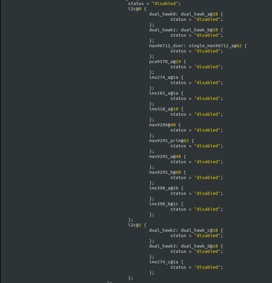 일반적으로 JETSON에서 지원하는 카메라를 관리하는 camera-module.dtsi가 include되어 있다. camera_modules.dtsi에 카메라 부분을 보면 status 항목을 전부 "disabled"로 변경한다.