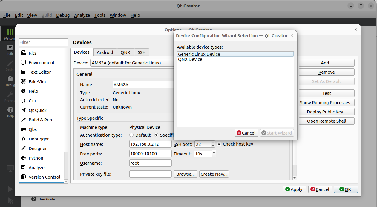 먼저 "Tools" 아래의 메뉴에서 "Option"을 클릭하고 왼쪽에서 "Device"를 선택한다. 그런 다음 "Add"를 클릭하여 "General Linux Device"를 구성한다. 장치 이름(ex) AM62A)을 입력 하고 "Host name" 아래에 IP 주소를 입력하고 "Username" 아래에 "root"를 입력한다.