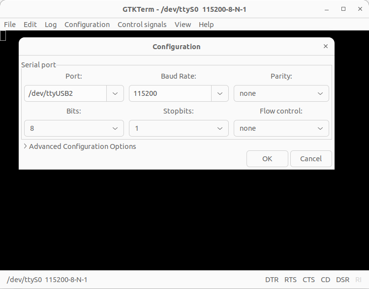 다음 설정으로 gtkterm 직렬 포트를 구성