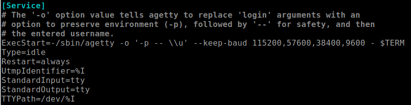 원본 내용은 보통 /usr/lib/systemd/system/serial-getty@.service에 있으며, 핵심 실행 라인은 다음과 같다.