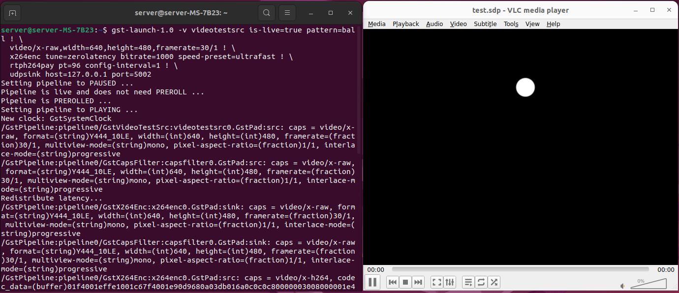 다음 명령을 실행하면 640×480 해상도의 테스트 패턴을 RTP(H.264) 형태로 송출한다.