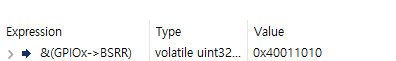 그 다음 if문 안으로 들어가 GPIOx->BSRR 값을 확인해보면 다음과 같이 나온다.