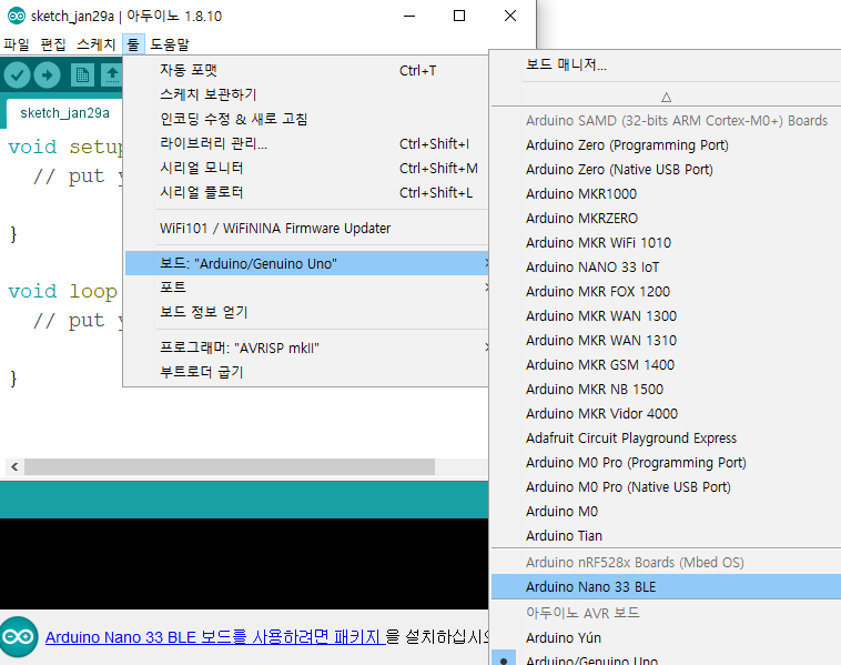 "툴" -> "보드" -> "보드 매니저..." 을 클릭하여 "nano 33"이라고 검색한 후 "Arduino Mbed OS Nano Boards"를 설치.