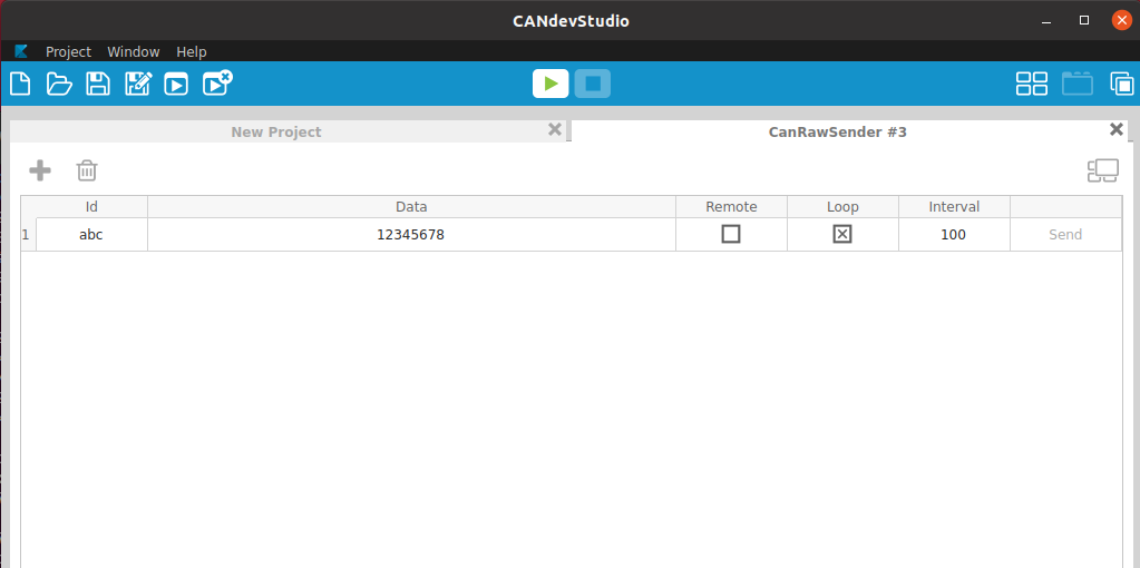 CanRawSender 를 열고 + 버튼을 클릭하여 ID, 데이터, 루프, 간격과 같은 영역을 채운다. 루프를 사용하지 않는 경우 매번 수동으로 전송 버튼을 눌러줘야 합니다. 다른 Data를 보내고 싶으면 + 버튼을 추가로 눌러줍니다. 그러면 ID 값을 다르게 주어 다른 Data를 보내는 것도 가능합니다.