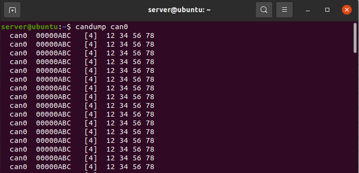 설치가 완료되면 candump 를 실행하여 버스의 메시지를 실시간으로 확인할 수 있다. can0 기기에서 모든 트래픽을 실시간으로 표시하려면 다음과 같이 할 수 있다.
