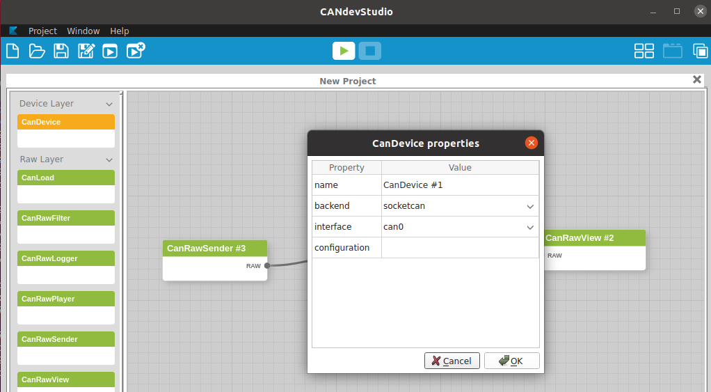 Device Layer 에서 CanDevice를 드래그하여 오른쪽에 추가하고 Raw Layer 에서 CanRawSender, CanRawView 를 각각 드래그하여 추가하고 다음과 같이 각 블럭을 연결한다.