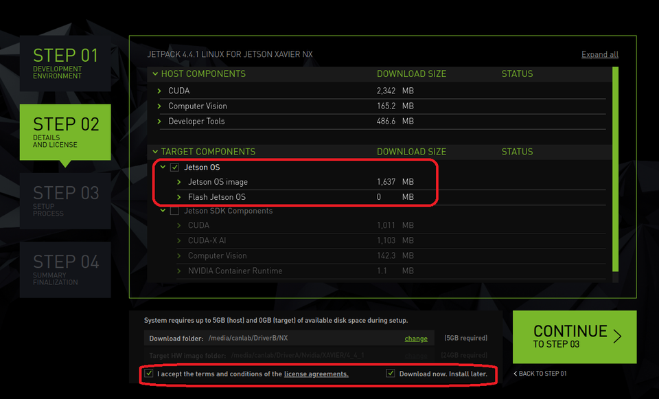 < 5 > 기본적으로 Jetson OS를 클릭하고 추가적으로 설치하고 싶으면 아래 Sdk Components도 클릭해줍니다. 그 다음 하단에 체크박스에 체크해준 뒤 넘어갑니다.