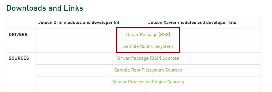 적절한 버전을 찾으면 클릭하여 다운로드한 페이지로 이동합니다. "L4T 드라이버 패키지(BSP)" 및 "샘플 루트 파일 시스템"을 찾아 클릭하여 드라이버 파일을 다운로드합니다.