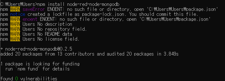 무사히 설치를 완료하였다면 Node-RED 사용자 디렉터리에서 다음 명령을 실행합니다.