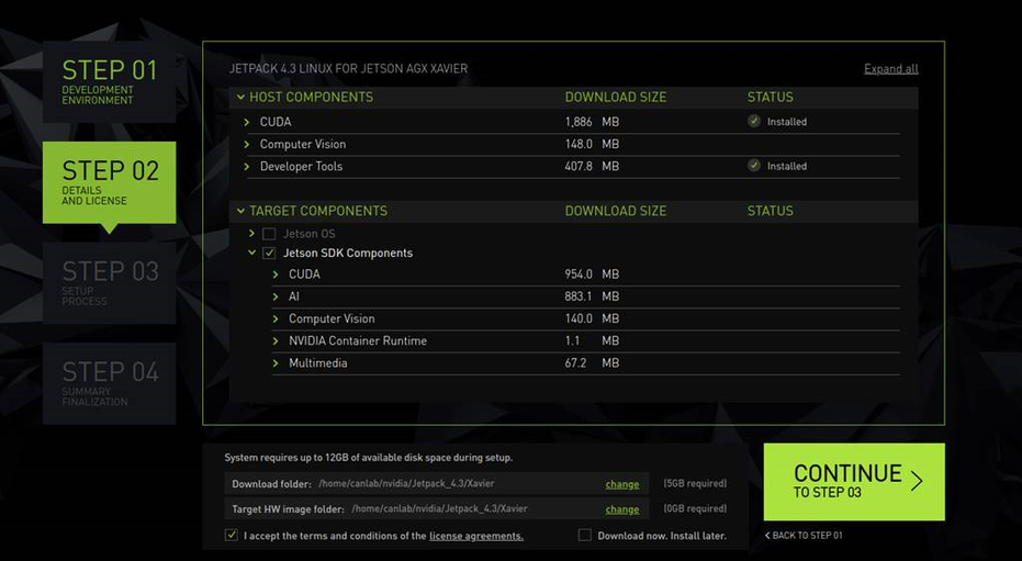 설치할 target components 중에서 Jetson OS 만 체크 해제 후 Continue 버튼을 클릭하여 다음 단계로 진행한다.
