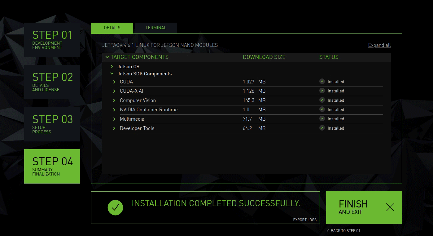 아래와 같은 창이 뜨면 설치가 완료된 것이다. FINISH 버튼을 눌러 SDK Manager를 종료하고 Jetson device를 재시작하여 설치된 것을 확인할 수 있다.