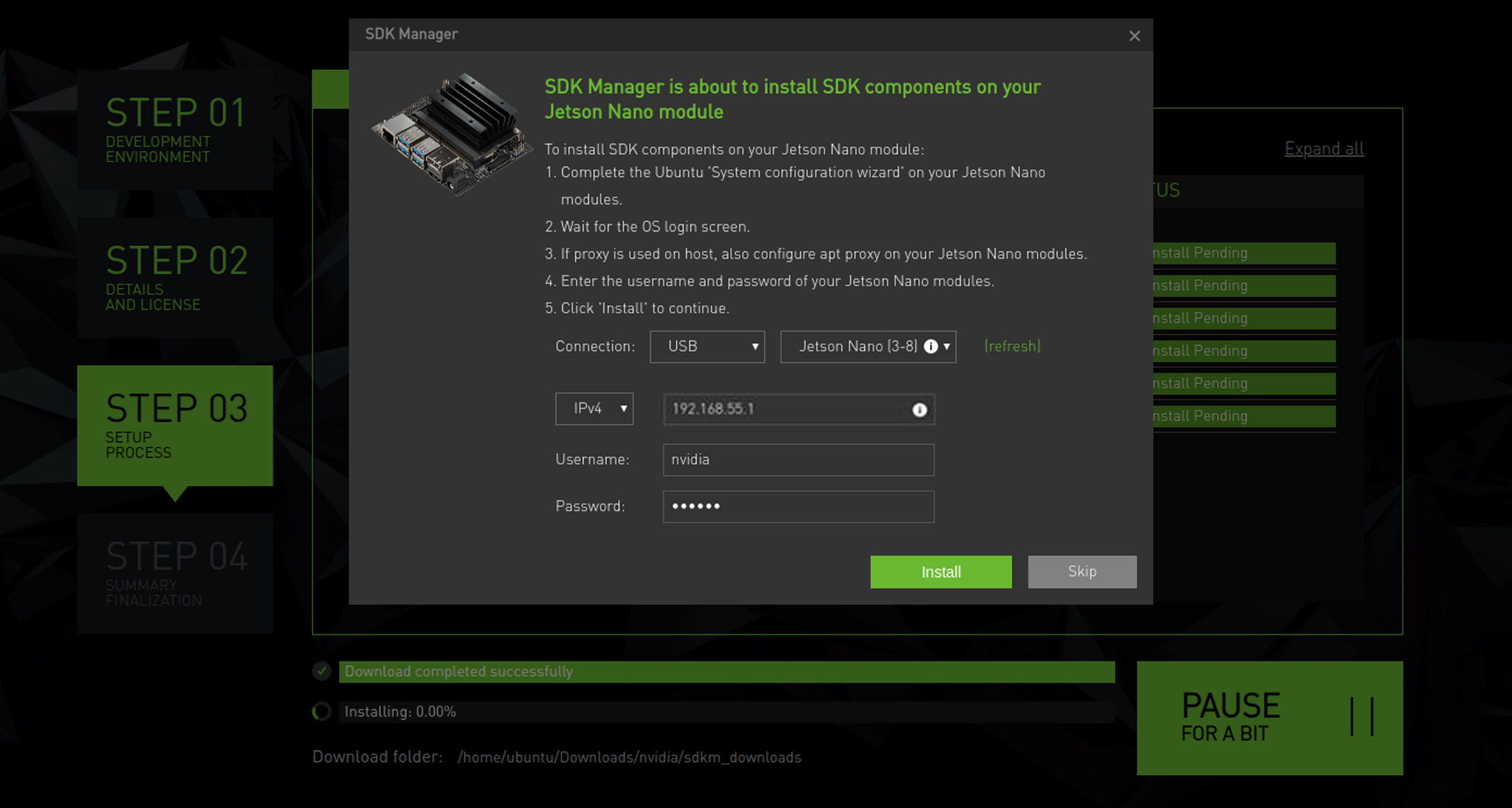 잠시 후 NVIDIA SDK Manager에서 IP 주소를 통해 장치에 연결해야 한다는 새 팝업 창이 나타난다 시스템이 이미 설치되어 있고 구성 요소 설치가 진행됨을 의미한다.