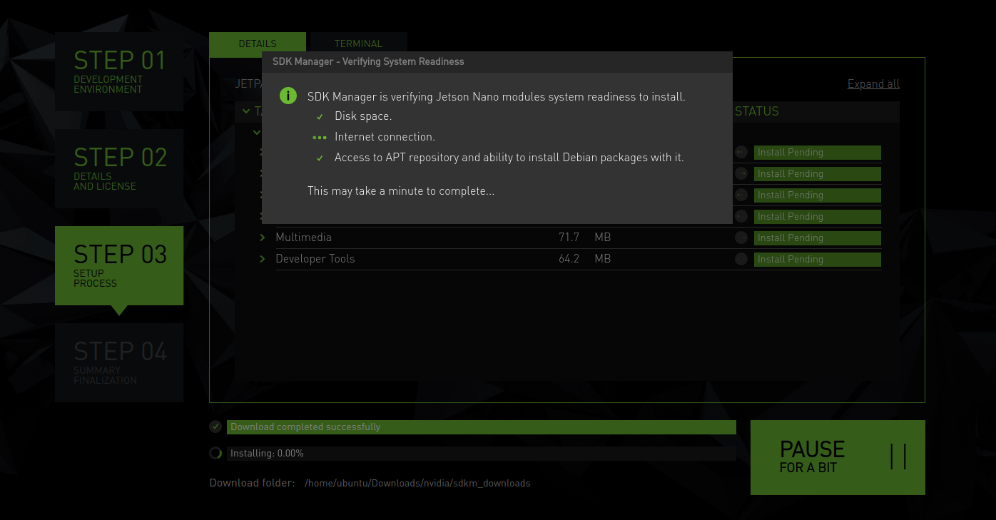 NVIDIA SDK Manager는 Jetson device에 연결을 시도하고 다음 SDK 구성 요소의 설치를 완료하기 위해 진행한다.