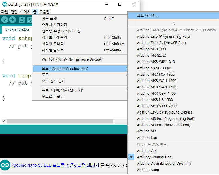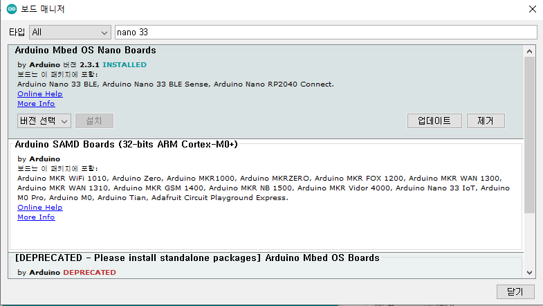 "툴" -> "보드" -> "보드 매니저..." 을 클릭하여 "nano 33"이라고 검색한 후 "Arduino Mbed OS Nano Boards"를 설치.